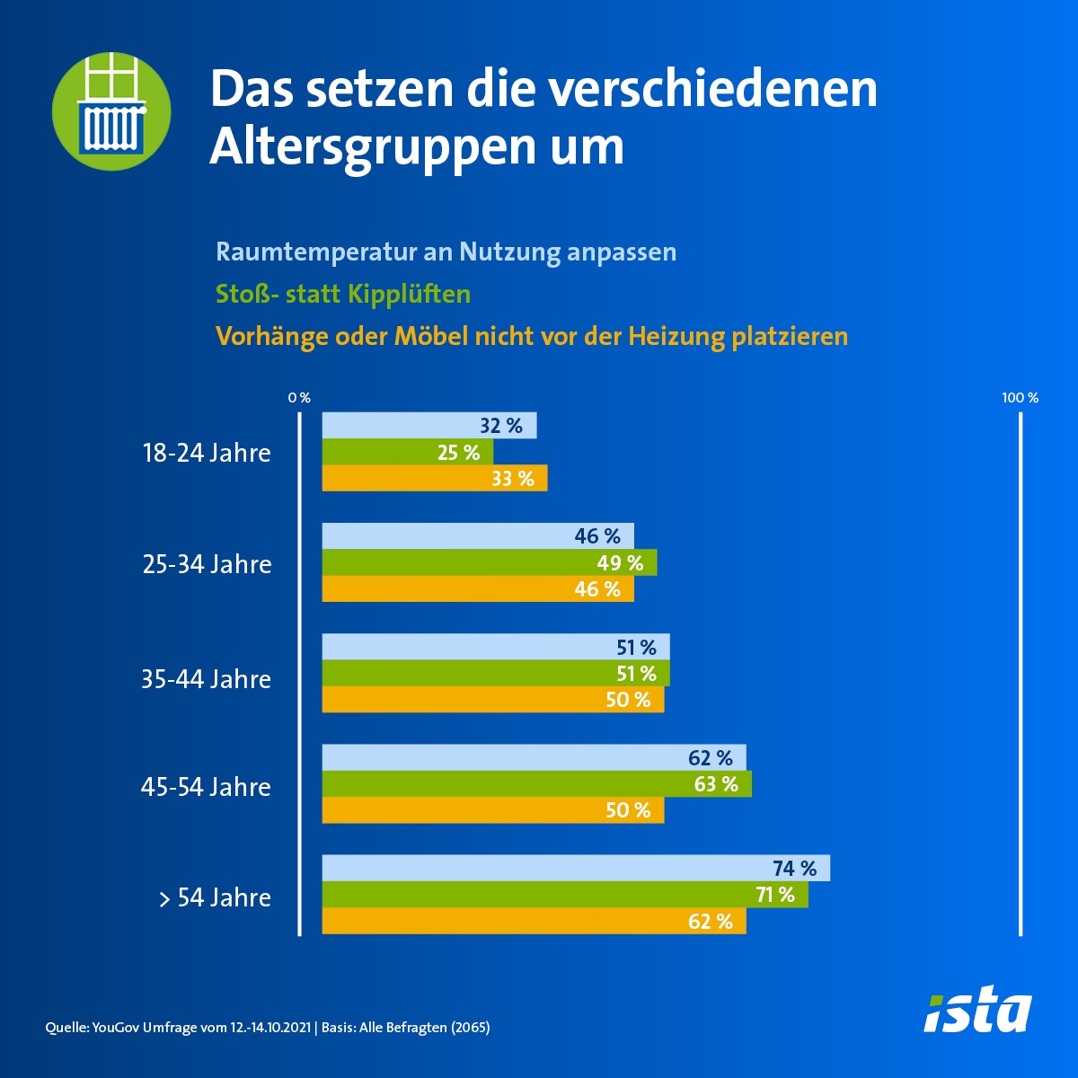Deutliche Unterschiede zeigen sich in den Altersgruppen, die den Schluss nahelegen: Je älter die Befragten, desto eher kennen sie die gängigen Energiespartipps und setzen diese um. So passen beispielsweise Dreiviertel (74 Prozent) der über 54-Jährigen die Raumtemperatur an; bei den 18- bis 24-Jährigen sind es lediglich gut ein Drittel (34 Prozent). Stoß- statt Kipplüften – das beachten 71 Prozent der ältesten Befragten, jedoch nur 25 Prozent der jüngsten. Den Tipp, Möbel oder Vorhänge nicht vor der Heizung zu platzieren, wenden 62 Prozent der über 54-Jährigen an – und 33 Prozent der 18- bis 24-Jährigen.