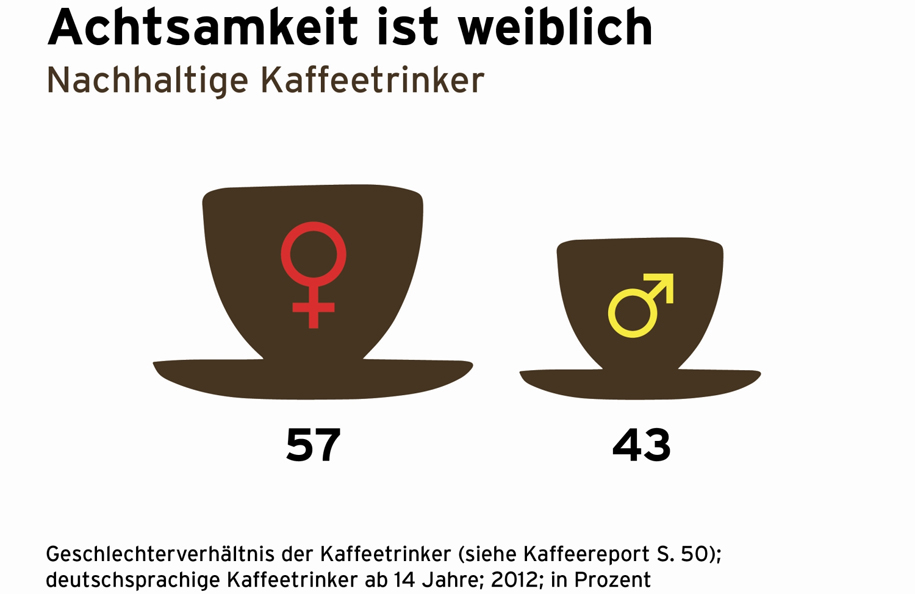 Deutliche Unterschiede ergeben sich bei der Geschlechterverteilung: 57 Prozent der nachhaltigen Kaffeetrinker sind weiblich, 43 Prozent männlich. Auch in der Kategorie der „Konsequenten“ sind die Frauen mit 53,6 Prozent in der Überzahl. Was die „Konsequenten“ Männer und Frauen eint, ist eine Vorliebe für eher nachhaltige Zubereitungsformen: Handfilter (30,3 Prozent), Espressokannen für die Herdplatte (20,2 Prozent) sowie Siebstempelkannen (19,7 Prozent) sind in ihrem Haushalt vorhanden.