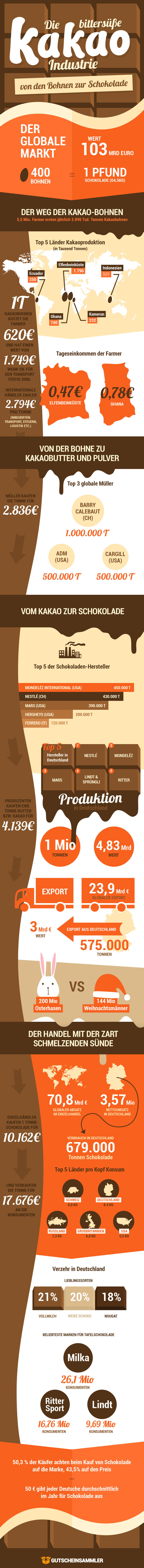 Viele lieben und hassen sie gleichzeitig. Schokolade – sie wird mit Glücksmomenten assoziiert, soll gegen Kummer helfen und fast jeder hat ab und zu ein unbeschreibliches Verlangen nach ihr. Schokolade gibt es in unzähligen Formen, Farben und Variationen. Der globale Markt für Schokolade wird auf über 103 Milliarden Euro jährlich geschätzt. Von der Bohne zum zartschmelzenden Genuss ist es ein sehr langer Weg. Die Experten vom Verbraucherportal Gutscheinsammler.de haben sich nicht nur den Prozess der Herstellung angeschaut, sondern auch die Preisentwicklung auf diesem Weg.