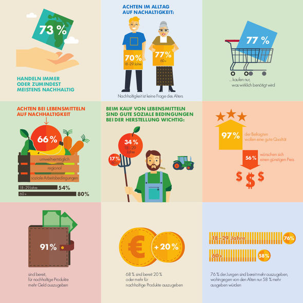 73 Prozent aller Befragten geben an, immer oder zumindest meistens nachhaltig zu handeln. Das bedeutet, rund drei Viertel der Deutschen achten auf Umwelt- und Sozialverträglichkeit sowie auf Wirtschaftlichkeit. Der Bewusstseinswandel hat alle Altersgruppen erfasst. Während bei den 18 bis 29-Jährigen 70 Prozent im Alltag auf Nachhaltigkeit Wert legen, sind es bei den über 60-Jährigen sogar 77 Prozent. Auch auf die Frage, was gekauft wird, fällt die Antwort deutlich aus: 77 Prozent der Bundesbürger kaufen immer oder zumindest meistens nur das, was wirklich benötigt wird.