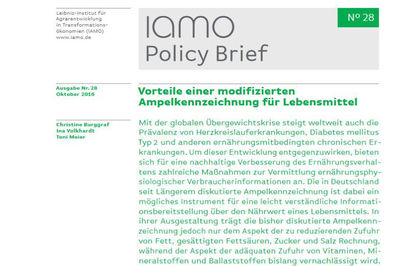 Im IAMO Policy Brief 28 "Vorteile einer modifizierten Ampelkennzeichnung für Lebensmittel" erläutern die Wissenschaftler ihren Vorschlag einer modifizierten Lebensmittelampel. Mit einer solchen Kennzeichnung wäre der ernährungsphysiologisch positive Beitrag der in den Lebensmitteln enthaltenen Vitamine, Mineralstoffe und Ballaststoffe deutlich für den Verbraucher erkennbar. Auch wenn die Ampelkennzeichnung keine allgemeingültige Einteilung in gesündere und ungesündere Lebensmittel bietet, stellt sie doch eine sinnvolle Ergänzung zu anderen Maßnahmen für eine gesündere Ernährung dar. Ähnlich wie für die Klassifizierung der als riskant bewerteten Inhaltsstoffe seitens der EU, könnten auch für die Bewertung des Gehalts positiver Inhaltsstoffe die von der EU vorgegebenen Referenzwerte der Ampel zugrunde gelegt werden. Hierbei würde es sich dann nicht um obere Richtwerte, sondern um adäquate Mindestmengen handeln.