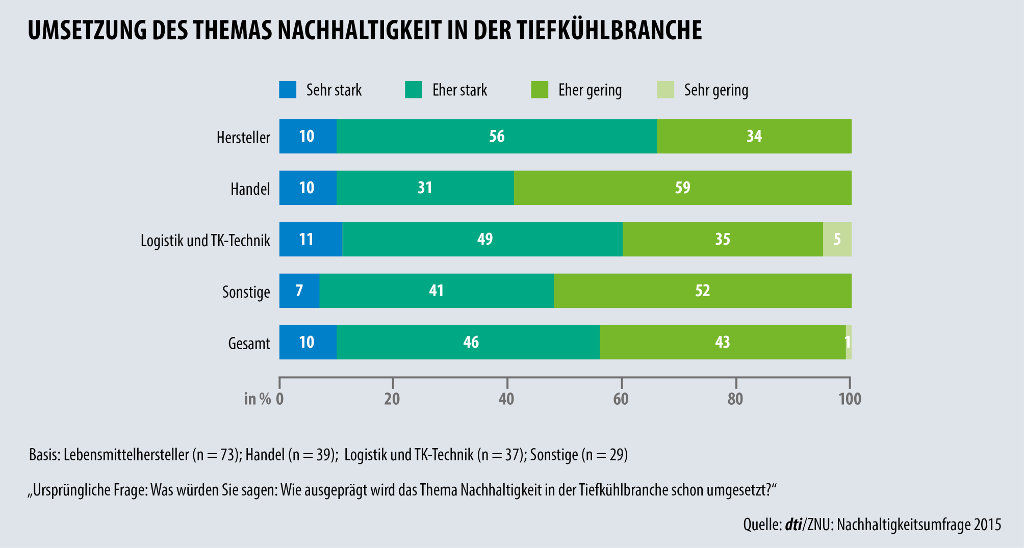 Die Tiefkühlwirtschaft hat Nachhaltigkeit fest etabliert auf ihrer Zukunftsagenda!.Eine Befragung des Zentrums für Nachhaltige Unternehmensführung der Universität Witten/Herdecke in der Tiefkühlwirtschaft zeigt, dass Nachhaltigkeit in den Unternehmen einen wichtigen Stellenwert einnimmt. 66 Prozent der Befragten halten Nachhaltigkeit in der Tiefkühlwirtschaft heute schon für eher bis sehr stark umgesetzt. Doch die Unternehmen setzen sich weitere Ziele.