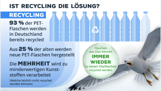 Aber was passiert mit den Flaschen nachdem sie leer sind? Deutschland ist die Mutter des Recyclings. Aufgrund unseres Pfandsystems werden 93 Prozent aller PET-Flaschen recycelt. Das ist doch super oder nicht? Die Antwort ist leider nein. Nur 25 Prozent des Plastiks wird verwendet um neue Flaschen herzustellen. Der Rest wird geschreddert und zu Plastikflakes verarbeitet. Diese werden verwendet, um Teppiche, Gartenstühle und Plastiktüten daraus zu machen, die wiederum nicht recycelbar sind. 2016 wurde eine freiwillige Selbstverpflichtung von 240 deutschen Firmen und dem Bundesministerium für Umwelt unterschrieben, dass sie ab jetzt ihre Plastiktüten kostenpflichtig machen. Zu den Unternehmen gehören größe Ketten, wie REWE, H&M und dm.