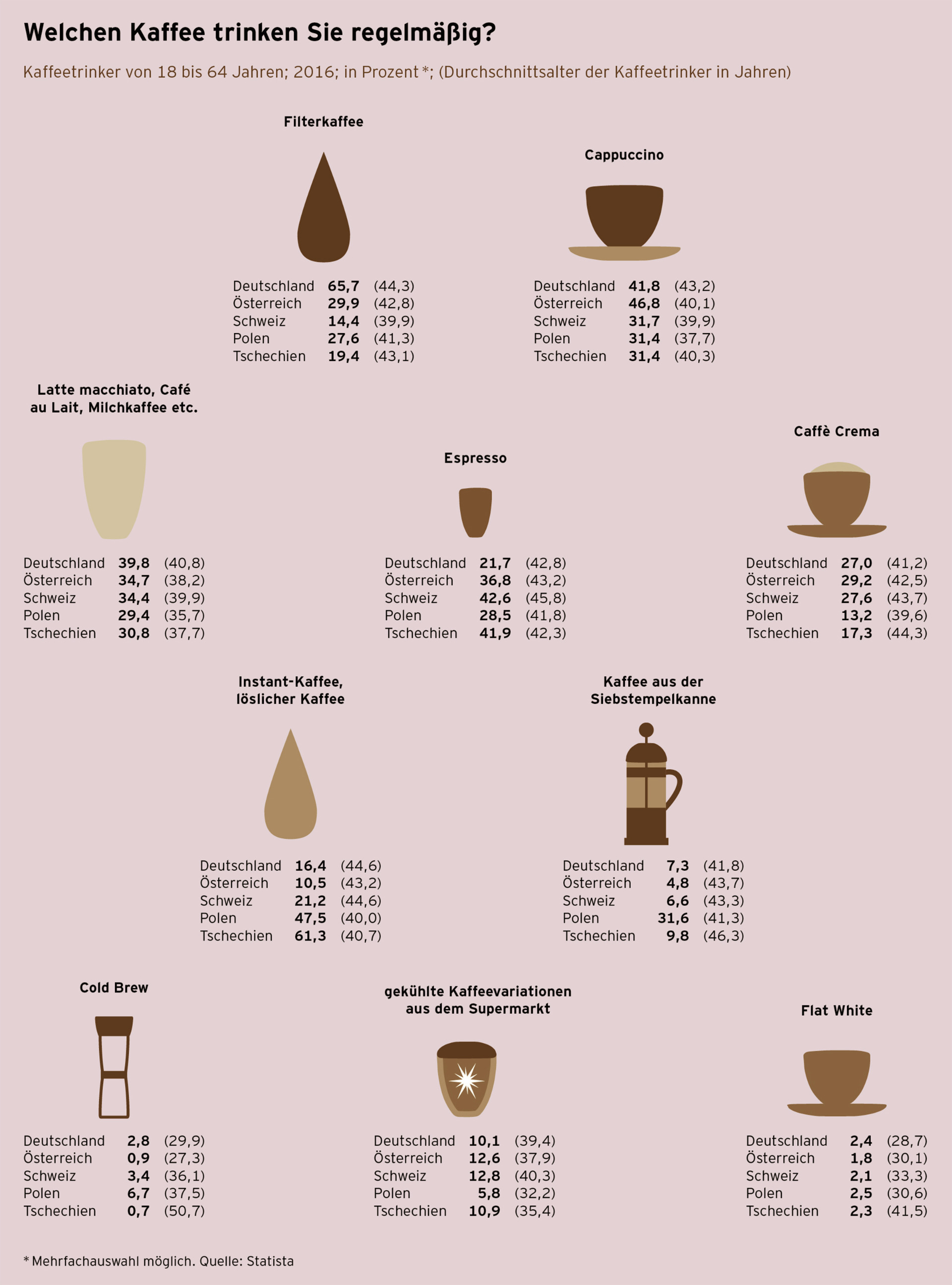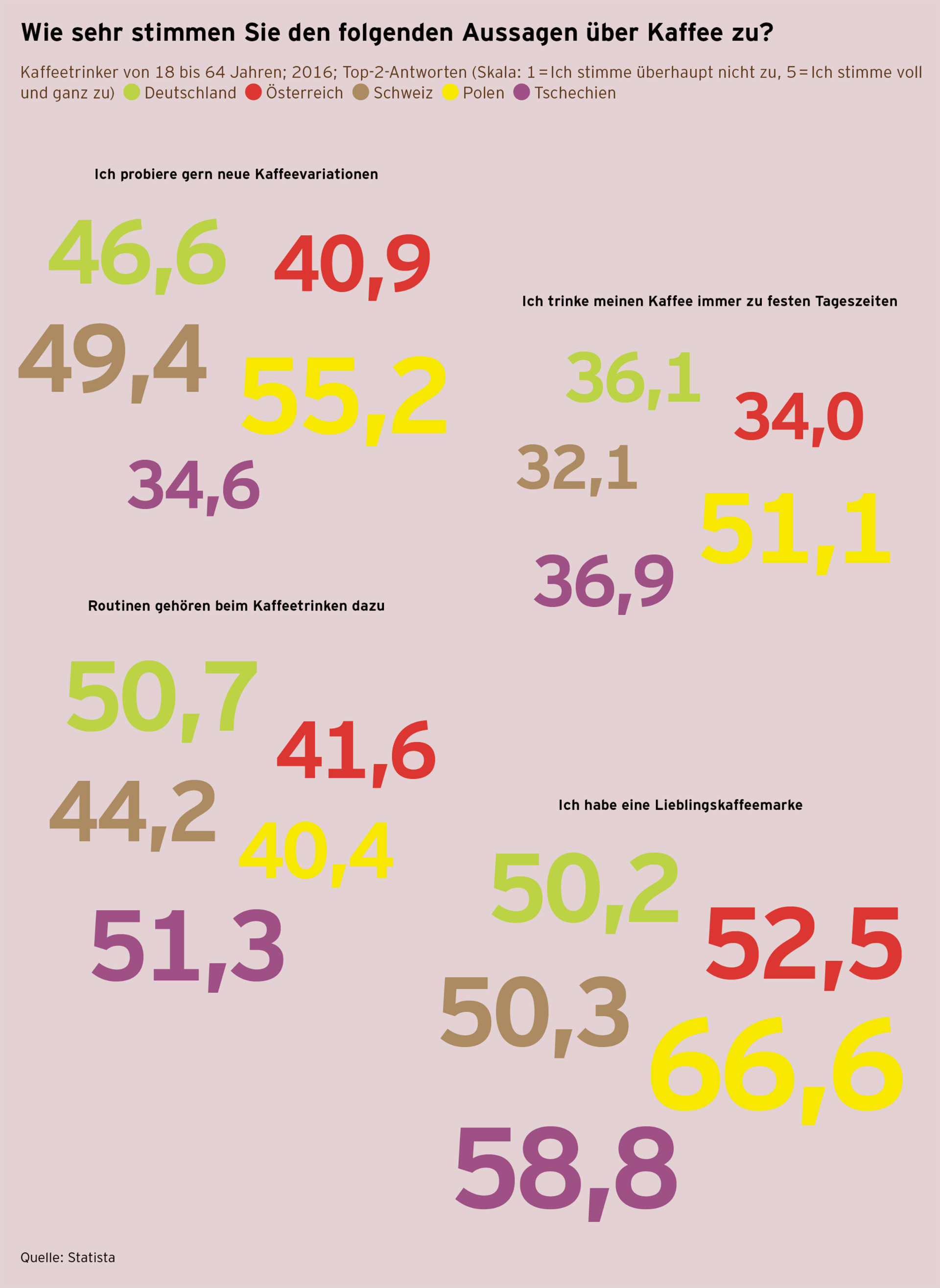 Die Liebe der Deutschen zum Filterkaffee (65,7 Prozent) teilen andere Europäer nicht. Das Herz der Tschechen schlägt für Instantkaffee (61,3 Prozent). In Österreich wiederum können nur 10,5 Prozent dem löslichen Kaffee etwas abgewinnen. Österreicher (52,5 Prozent) und Schweizer (51,5 Prozent) trinken Kaffee vor allem, weil er ihnen schmeckt. Anders die Polen: Sie sehen in ihm in erster Linie eine Energiequelle (50 Prozent).