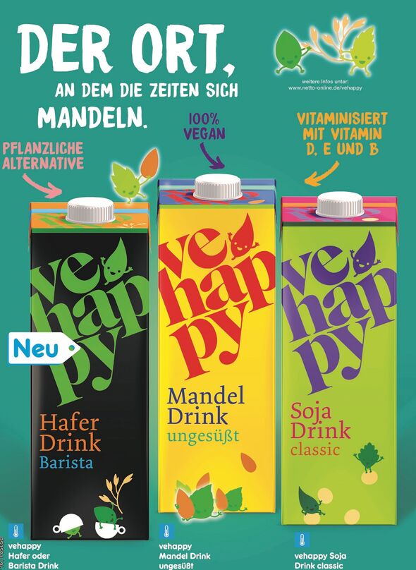 Die pflanzenbasierten Milch- und Joghurtalternativen sind mit den stylisch-bunten Designs ein echter Hingucker im Regal und auch geschmacklich überzeugen die Veggie-Produkte. Voll im Trend: Schon 1,13 Millionen Menschen setzten 2020 in Deutschland auf eine vegane Ernährung – Tendenz weiter steigend. Mit vehappy möchte Netto Marken-Discount nicht ausschließlich Veganerinnen und Veganer ansprechen, sondern auch Fans von bewussterer, gesünderer Ernährung eine leckere Alternative bieten. Das Plus für die Umwelt: Die Rohstoffe aller Artikel stammen ausschließlich aus Europa und die Joghurtalternative aus Soja ist vollständig klimaneutral. Mit dem Verzicht auf tierische Inhaltsstoffe werden außerdem die natürlichen Ressourcen geschont. Alle Artikel sind in den bundesweit rund 4.270 Filialen von Netto Marken-Discount sowie teilweise im Netto Online-Shop erhältlich.