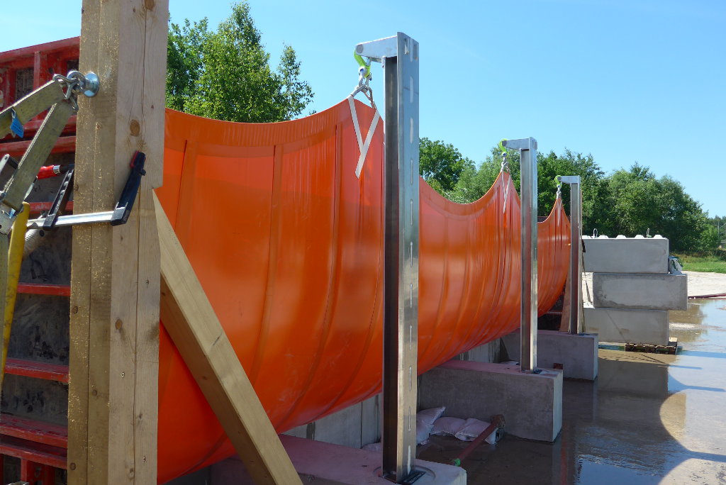 Selbst wenn Treibgut gegen das System prallt, wirken nahezu ausschließlich Normalkräfte in den Stützen. „Diese können somit extrem schlank und leicht ausgeführt werden“, erklärt Gelbrich. Dies haben die Entwickler durch eine spezielle Geometrie der Membran und eine bestimmte Anordnung der Komponenten erreicht. Die Konstruktion lässt Stauhöhen bis 1,50 Meter zu. Treibgutanprall hält sie nachweislich bis 400 Kilogramm aus – getestet bei einem Aufprallwinkel von 90 Grad zur Fließrichtung und einer Geschwindigkeit von vier Metern pro Sekunde.„Die leichtbaugerechte Ausführung lässt den Aufbau selbst mehrerer hundert Meter Hochwasserschutz problemlos durch zwei Personen zu“, hebt Gelbrich hervor.