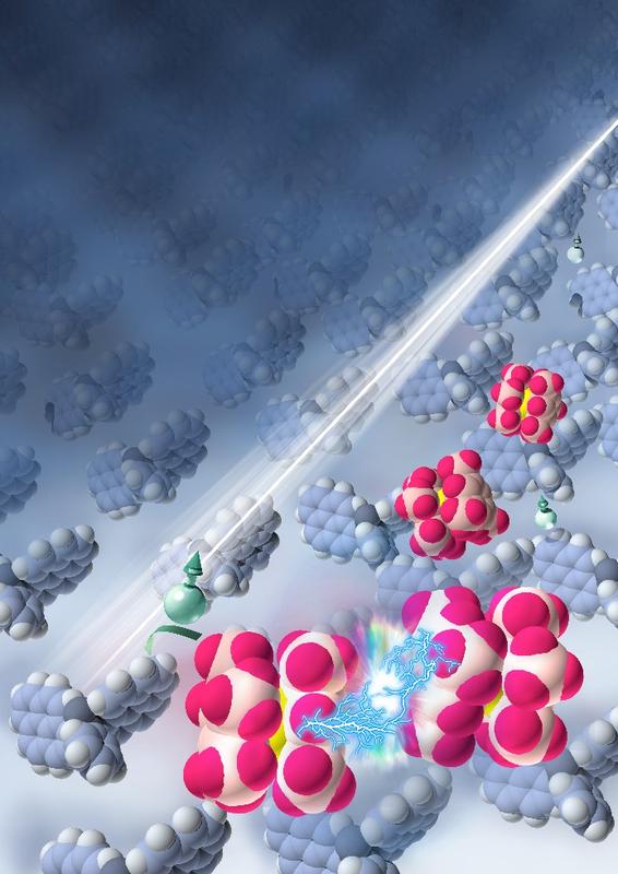 Der revolutionäre zweite Schritt bestand nun darin, das Gemisch zu beleuchten. Die einfallenden Photonen zerlegen die Dimere in einem Mehrstufenprozess wieder in die aktiven Ausgangsmoleküle, die dann ihre Wirkung als n-Dotanden voll entfalten konnten.