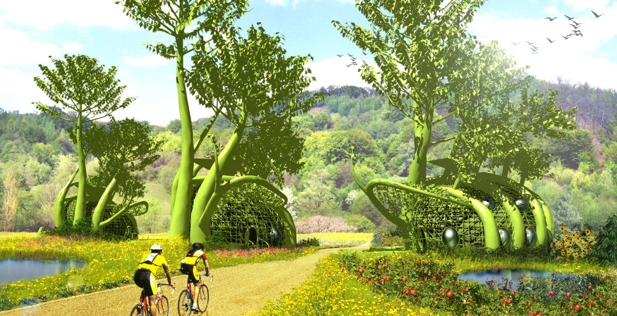 Eine ähnliche, aber noch radikalere Idee verfolgt Mitchell Joachim. Der promovierte Architekt forscht seit Jahren an nachhaltiger Architektur und entwickelte die Vision des „Fab Tree Hab“: Aus gentechnisch veränderten Bäumen sollen „gezüchtete“ Häuser entstehen, die in einer symbiotischen Beziehung zu ihrer Umwelt stehen. Dabei produziert ein Fab Tree Hab während seines gesamten Lebenszyklus Nahrung für seine Bewohner. Auch hier entsteht kein Abfall oder Abwasser im klassischen Sinne, alles findet im geschlossenen Kreislauf zwischen Ökosystem und Haus seine (Wieder-)Verwendung.