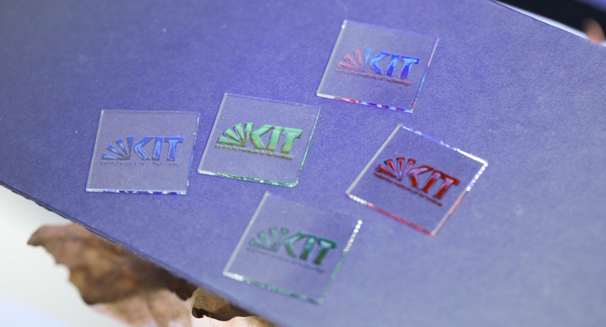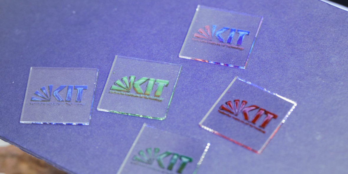 Gedruckte farbige Perowskit-Solarzellen in Form des Logos des KIT.