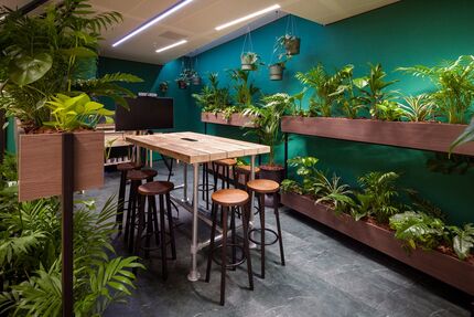 In der voll ausgestatteten Miele-Küche können sich die Kolleginnen und Kollegen mit Kaffee und Tee (in einer vorgewärmten Tasse), gefiltertem Wasser oder einem gekühlten Softdrink aus dem Kühlschrank versorgen. Mittags kocht das Team mit frischen Kräutern direkt aus dem „Green Room“, der sich direkt neben den Kochinseln befindet. Noch mehr Miele-Produkte können sie im hauseigenen Miele Experience Center nutzen. Die Waschmaschinen und Trockner erfreuen sich bereits großer Beliebtheit: Die Kolleginnen und Kollegen bringen ihre Wäsche mit und nehmen sie am Ende des Tages frisch gewaschen mit nach Hause.
