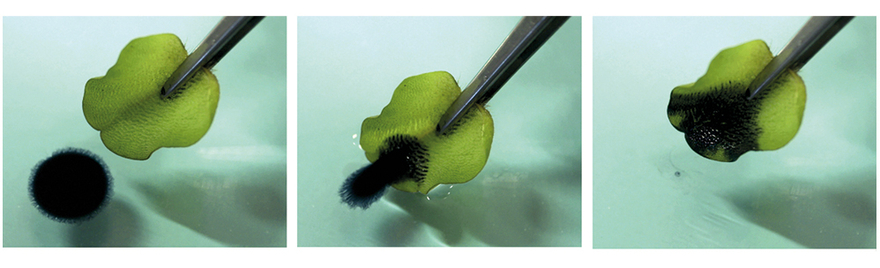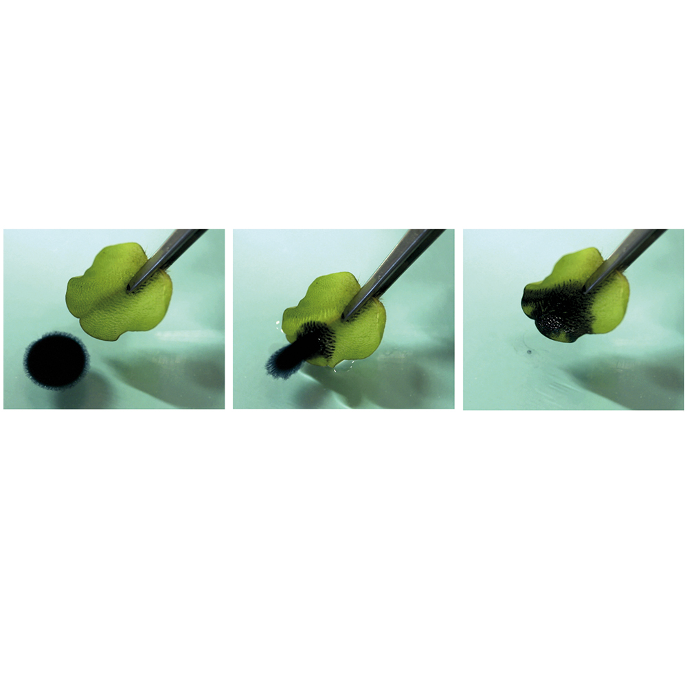 Für viele technische Anwendungen gibt es unerwartete Lösungen aus dem Bereich der Biologie. Jahrmillionen der Evolution haben dazu geführt, dass die Oberflächen lebender Organismen für ihre Interaktion mit der Umwelt optimiert wurden. Lösungen, die für Materialwissenschaftler oft eher ungewohnt und schwer zu akzeptieren sind. Die langjährige Untersuchung von rund 20.000 verschiedenen Arten an der Uni Bonn zeigte, dass es eine nahezu unendliche Vielfalt an Strukturen und Funktionalitäten gibt. Einige Arten zeichnen sich besonders durch ihre hervorragende Öladsorption aus. Beispielsweise adsorbieren die Blätter des Schwimmfarns Salvinia molesta Öl sehr schnell, separieren es gleichzeitig von Wasseroberflächen und transportieren es auf ihren Oberflächen (Abbildung 1 Sekundenschnelle Adsorption eines Tropfens Altöls durch ein Blatt des Schwimmfarns Salvinia molesta, schauen Sie sich auch das Video des Phänomens an).
