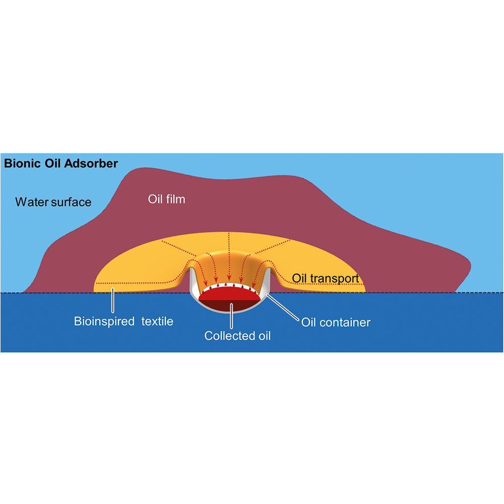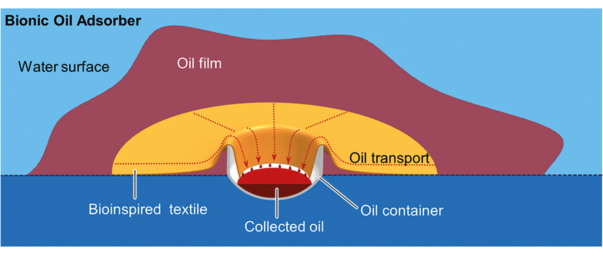 Die Beobachtungen inspirierten dazu, den Effekt auf technische Textilien zur Trennung von Öl und Wasser zu übertragen. Es handelt sich um ein superhydrophobes Abstandsgewirk, das industriell hergestellt werden kann und daher leicht skalierbar ist.