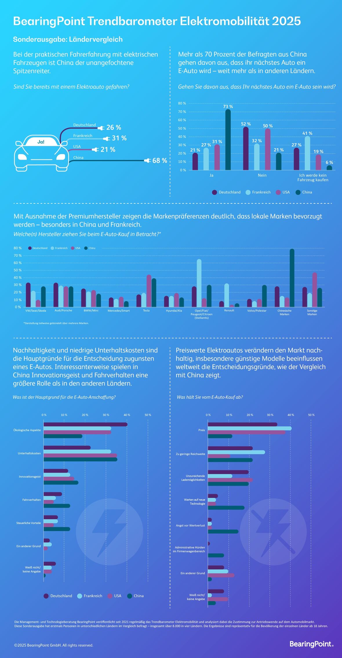 Welche Rückschlüsse lassen sich auf das Kauf- und Nutzungsverhalten beim Thema Elektromobilität vor dem Hintergrund herausfordernder ökonomischer Rahmenbedingungen, verschärfter Handelskonflikte und multipler geopolitischer Krisen ziehen? Wie bedingen sich Mentalitätsunterschiede und Markenpräferenzen im zwischenstaatlichen Vergleich? Nachdem die Management- und Technologieberatung BearingPoint in ihrem ersten Trendbarometer Elektromobilität zu Jahresbeginn 2025 bereits Marktgeschehen und Markenpräferenzen in der Bundesrepublik genauer unter die Lupe genommen hatte, wurde die Umfrage nun erstmals auch über Deutschland hinaus in weiteren relevanten Märkten durchgeführt.
