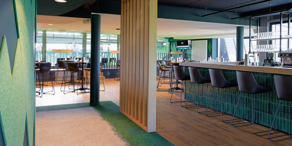 Das geschlossene Stockwerk, ausgelegt für maximal 199 Personen, weist drei verschiedene Zonen auf: den VIP-Bereich mit personalisierten Tischen und Blick ins Stadion, auf der gegenüberliegenden Seite die Gästelounge mit anschließender Terrasse und Richtung Westen eine Bar, die den Blick auf die Weser eröffnet. „Die Übergänge sind dabei fließend. Die Teppichfliese UR101 aus der biophilen Kollektion Urban Retreat ist durch ihre farbliche Aufteilung in leuchtendes Grün und urbane Braun- und Grautöne prädestiniert dafür, Zonierungen im Raum zu schaffen.“ Im mit Sesseln und Hockern ausgestatteten, ruhigeren Lounge-Bereich schafft sie deshalb in Kombination mit den Produkten UR102 und UR103, die beide Farbgebungen aufgreifen, eine ideale Basis und einen sanften Übergang: „Durch die mehrfarbige Struktur der Teppichfliesen gehen sie nahtlos in die in Holzoptik gehaltene LVT-Kollektion Level Set – Textured Woodgrains über.“ Diese gestaltet den VIP- und Barbereich besonders hochwertig, indem sie texturierte Holzmaserungen imitiert. „Dem Anspruch, den Raum möglichst natürlich zu gestalten, konnten wir mithilfe der Bodenbeläge von Interface, die organische Verläufe nachahmen, gerecht werden“, fasst es von Müller zusammen. „Außerdem erfüllten wir mit unserer Produktauswahl die hohen Brandschutzbestimmungen: Die Imitate sind feuerbeständiger als organische Materialien und dank ihres Fliesenformats leicht auszutauschen.“