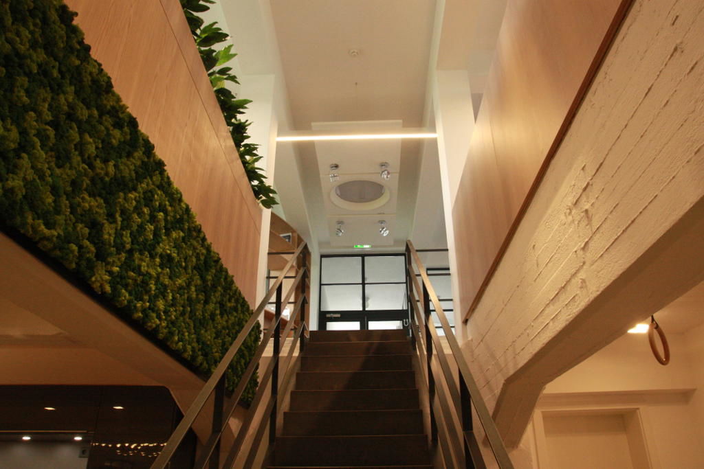 Verschiedene medizinische Untersuchungen und auch das Bauchgefühl weisen auf die positiven Effekte hin. „Schon ein zehnminütiger Spaziergang im Wald entspannt uns, macht uns konzentrierter. Oder, um es ganz kurz zu sagen: Die Natur tut uns gut“, erklärt Tanja Künstler. „Das Nächstliegende beim Biophilic Design ist natürlich, die Natur selbst in den Raum zu holen, zum Beispiel durch Pflanzen oder Wasser“, fährt Künstler fort. Das Design-Concept umfasse jedoch weitaus mehr, als ein paar Zimmerpflanzen in den Raum zu stellen. Zu den insgesamt 14 Mustern des Biophilic Design zählen auch Analogien der Natur, die sich hier in biomorphen Strukturen einer Wand aus echten Schiefersteinen wiederfinden, oder in dem nachempfundenen Moosfeld aus Teppichfaser am Treppenauge zum Kellergeschoss.