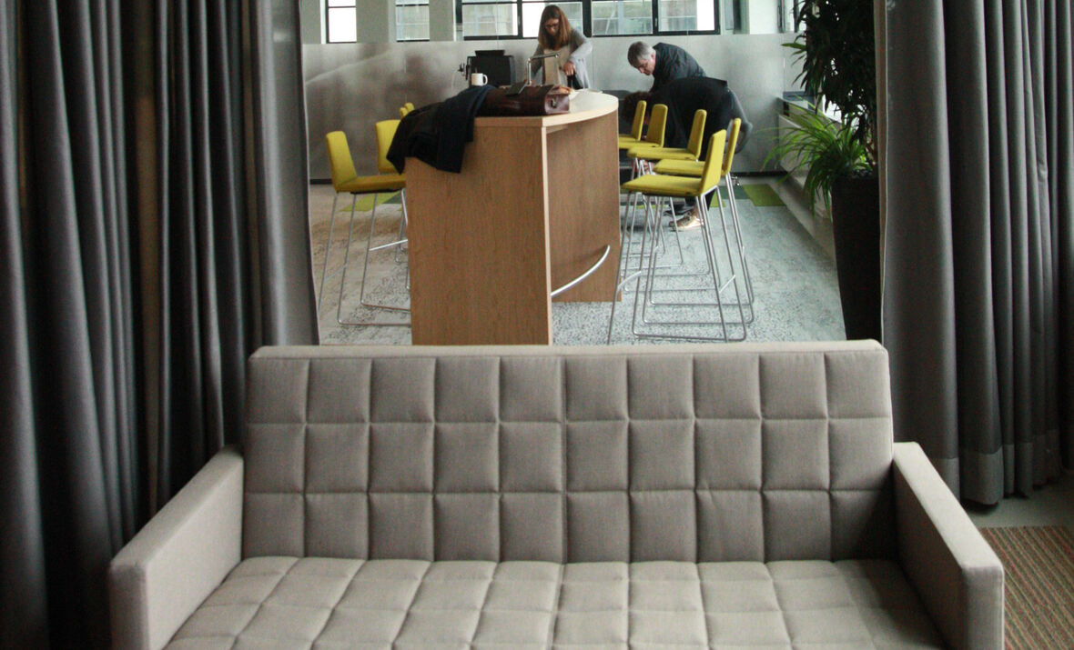 Eines ihrer Spezialgebiete sind die Gestaltungsprinzipien von Biophilic Design nach Terrapin Bright Green, die hier als nachhaltiger Ansatz der Arbeitsraum-Gestaltung angewandt werden. Was das bedeutet, lässt ein erster Blick in den öffentlichen Bürobereich ahnen: Eine Wasserwand im Treppenbereich plätschert vom Erdgeschoss in den Keller. Sie sorgt für ein angenehmes Raumklima und schirmt den hinteren Bereich des Trennwand-losen, offenen Raumes etwas ab. Um Wasserwand und Treppenabgang herum folgt der Blick den typischen rechtwinkligen Rastern in der Beleuchtung, den Deckenstützen, den original erhaltenen Sprossenfenstern und Fliesen. Rugs, das sind spezielle Zuschnitte von Teppichfließen, unterstreichen die klaren Linien und machen sie gleichzeitig freundlicher. Stilechte Loungemöbel stehen im Empfangsbereich – von hier aus überblickt man den gesamten Campusteil, den Mies van der Rohe errichtet hat.