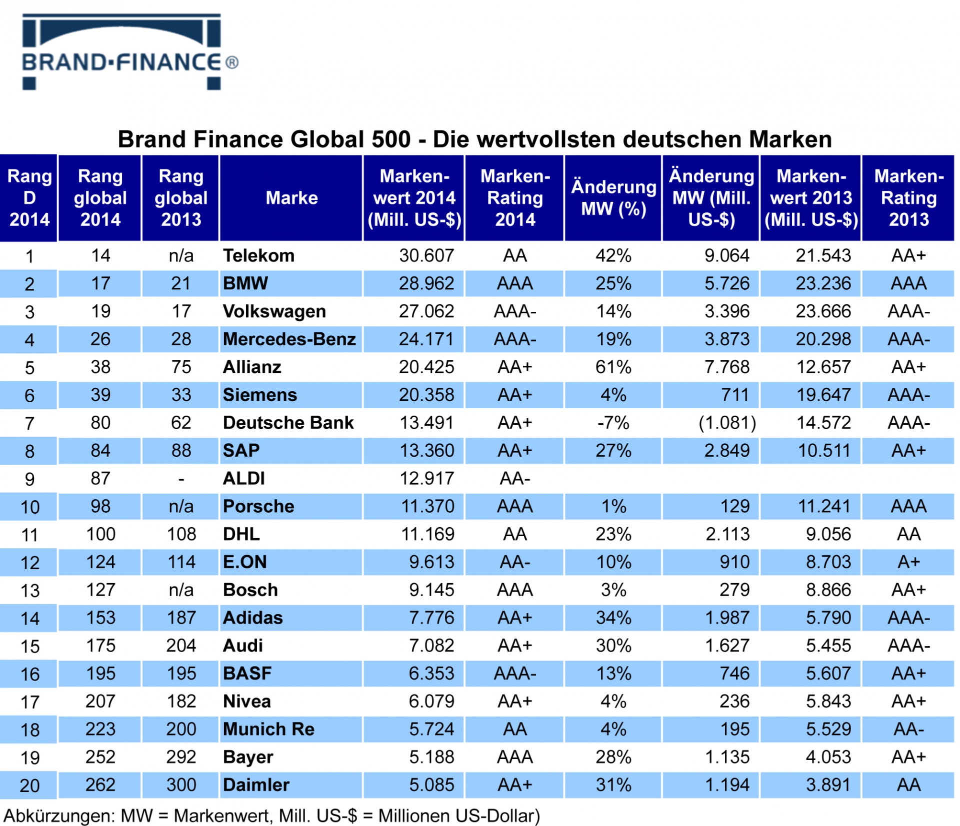 Der Wert der Marke Telekom wird mit 30,6 Milliarden US-Dollar berechnet, dicht gefolgt von BMW mit knapp 29 Milliarden US-Dollar. Auf den Plätzen drei und vier folgen Volkswagen mit rund 27 Milliarden US-Dollar und Mercedes-Benz mit rund 24,2 Milliarden US-Dollar. Dass im "Autoland Deutschland" eine Telekommunikationsmarke die Autohersteller vom angestammten ersten Platz verdrängt, unterstreicht die wachsende Bedeutung der Technologiebranche und folgt dem globalen Trend, so die Experten von Brand Finance.
