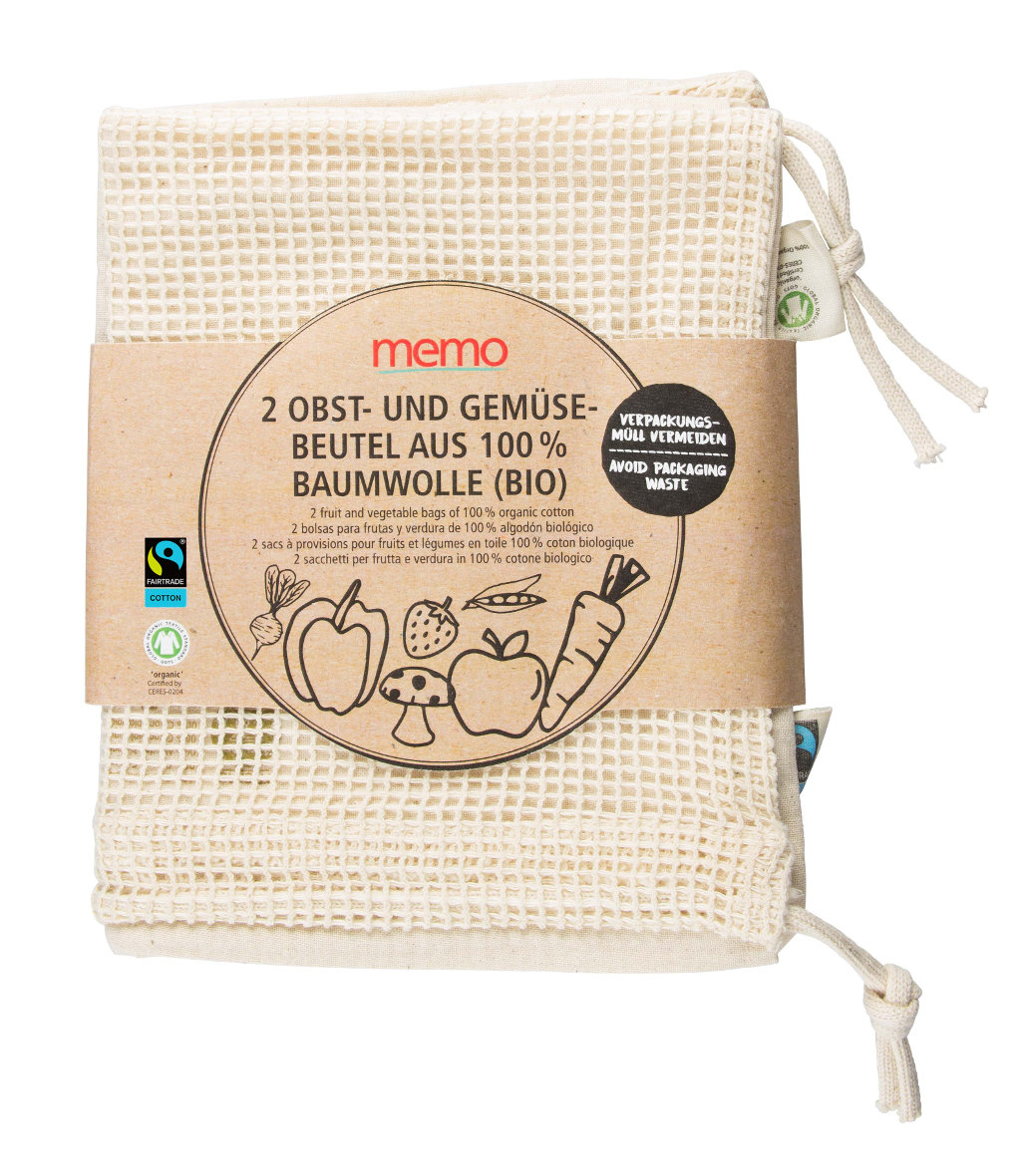 Die memo AG sagt den dünnwandigen Kunststoffbeuteln, die es an der Obst- und Gemüsetheke kostenlos gibt, den Kampf an: Neu im Markensortiment ist der Zweierpack Beutel für Obst und Gemüse aus 100 Prozent Bio-Baumwolle. Die Beutel sind GOTS- und Fairtrade-zertifiziert und haben eine komfortable Größe – beispielsweise für bis zu drei Kilogramm Kartoffeln.