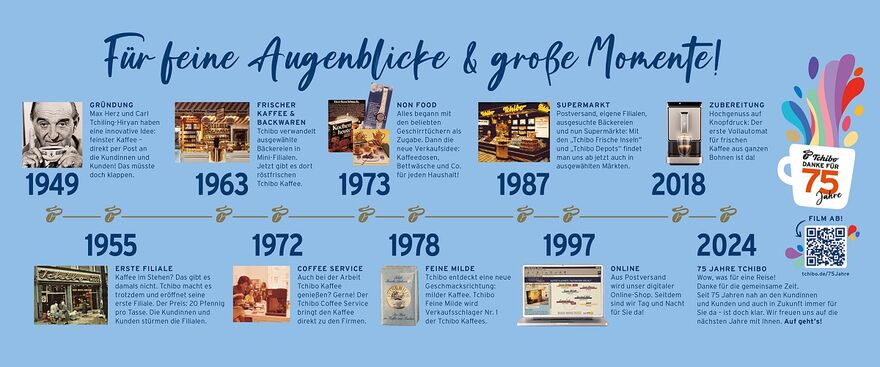 Dass sich das Handelsunternehmen immer wieder neu erfinden kann, haben die vorigen 75 Jahre gezeigt. Das Jubiläum feiert Tchibo jedenfalls mit zahlreichen Aktionen, einer Jubiläumszeitschrift und einem Blick auf die gemeinsamen Kaffee-Momente. Hier geht es zur Jubiläumswebsite.
