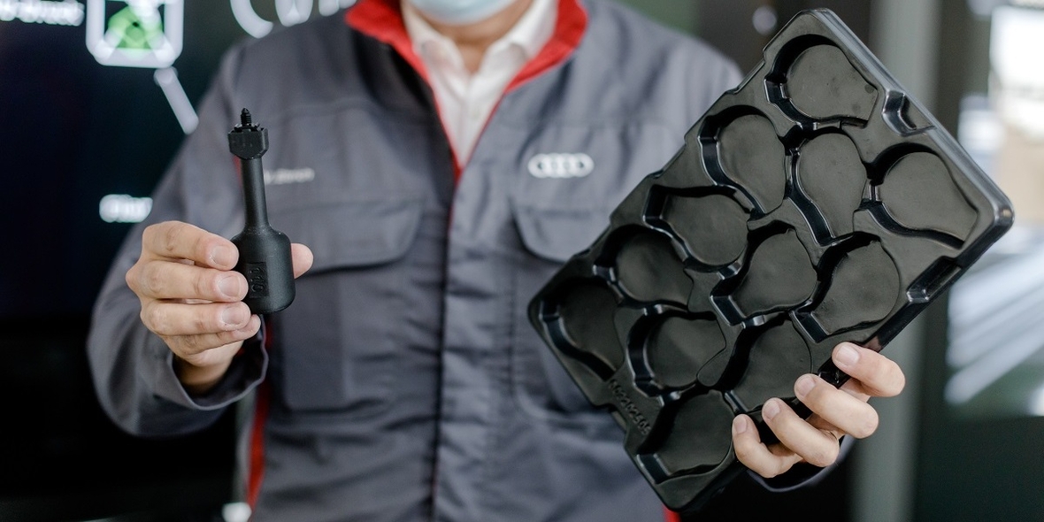 Wie wichtig Audi ein nachhaltiger Umgang mit Ressourcen ist, wird unter anderem bei einem neuen Pilotprojekt am Standort Neckarsulm deutlich: Hier entstehen 3D-gedruckte Hilfsmittel für die Fahrzeugproduktion – seit kurzem hergestellt aus Abfällen, die genau dort anfallen. Diese Arbeitshilfen bestehen nicht nur aus recyceltem Material, sie unterstützen auch ergonomisches und sicheres Arbeiten und sind exakt auf die Anforderungen der Mitarbeitenden zugeschnitten.