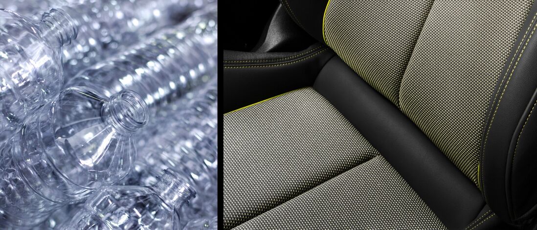 … in der Sitzanlage eines Audi A3 bis zu 45 PET-Flaschen à 1,5 Liter stecken? Für den Teppich werden weitere 62 PET-Flaschen recycelt.