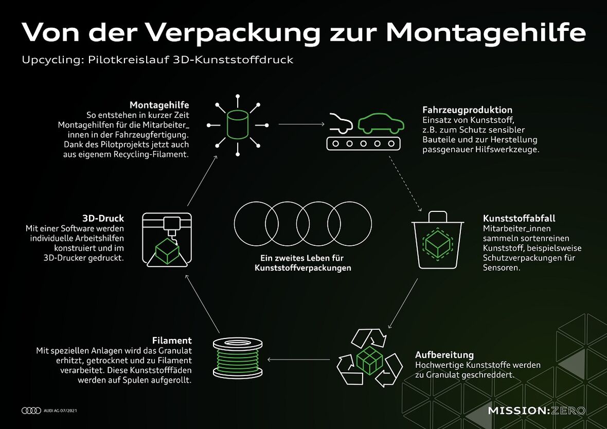 Die Idee für die 3D-gedruckten Montagehilfen aus Kunststoffabfall ist so einfach wie wirkungsvoll. „Unser Ziel war es, einen Materialkreislauf zu schaffen und so einen Teil der Mischkunststoffe wiederzuverwerten, die in der Produktion etwa eines Audi A7 anfallen“, erklärt Projektleiter Volker Eitrich. Im aktuellen Pilotprojekt werden dafür nun Verpackungen, die zum Schutz von sensiblen Bauteilen – wie Lautsprechern und Sensoren – im Einsatz sind, sortenrein gesammelt. Mit speziellen Anlagen werden diese sogenannten Kunststoffblister zu Granulat geschreddert und getrocknet. Ein „Filament Maker“ erhitzt das Granulat auf bis zu 450 Grad und presst es anschließend zu Kunststofffäden – Filament genannt. Dies ist das Ausgangsmaterial für die 3D-Drucker, mit denen das Expertenteam passgenaue Arbeitshilfen für die Fahrzeugproduktion herstellen kann. Das Team von Audi arbeitet dabei eng mit dem niederländischen Start-up „3devo“ zusammen, von dem auch die Technik zur Filamentherstellung stammt.
