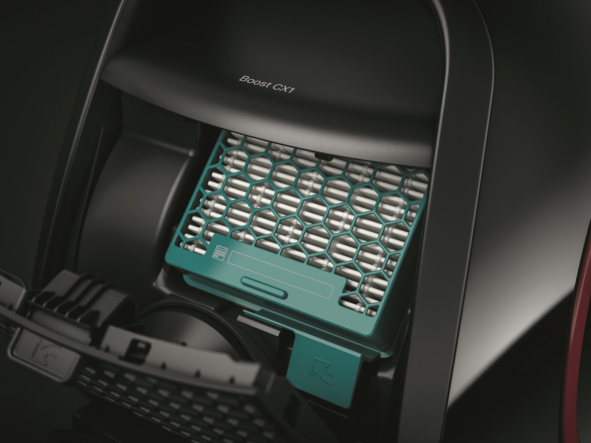 Einen eindrücklichen Beitrag leistet hierzu das von Grund auf neu entwickelte Bodenmodul, das in fast allen neuen Trocknermodellen zum Einsatz kommt. Dank eines innovativen Fertigungsverfahrens, bei dem der Kunststoff mit Stickstoff angereichert wird, werden 30 Prozent Material eingespart – bei gleichzeitiger Verbesserung der Stabilität. Und für den Deckel dieses Moduls kommt seit 2021 erstmals Kunststoff-Rezyklat zum Einsatz. Übers Jahr gerechnet, summiert sich die daraus resultierende Materialersparnis auf mehrere hundert Tonnen Granulat. Darüber hinaus stellt das Unternehmen in seinem Werk Bielefeld vermehrt Staubsaugerzubehör wie Polsterdüsen, Fugendüsen, Möbelpinsel und Spezialbürsten aus Rezyklat her. Weitere Elemente des Saugzubehörs werden derzeit auf ihre Umstellbarkeit geprüft, darunter auch die Abluftfilter. Bereits heute besteht der Filterrahmen des Hygiene AirClean Filters beim neuen Staubsauger Boost CX1 aus 100 Prozent Rezyklat.