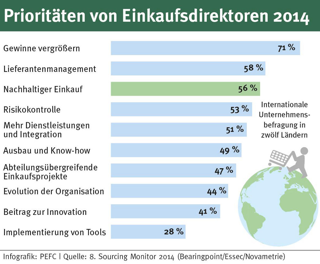Einer internationalen Studie zufolge gehört ein nachhaltiger Einkauf 2014 erstmals zu den wichtigsten drei Prioriäten von Unternehmen. Eine gute Nachricht auch für den Schutz der Tropenwälder, denn damit wird den Anbietern von Holz und Papier aus problematischen oder unklareren Quellen die Geschäftsgrundlage entzogen. Um den Kauf von illegal geschlagenem Holz zu vermeiden, orientieren sich die Firmen an den Herkunftsnachweisen anerkannter Waldzertifizierungsorganisationen wie PEFC.
