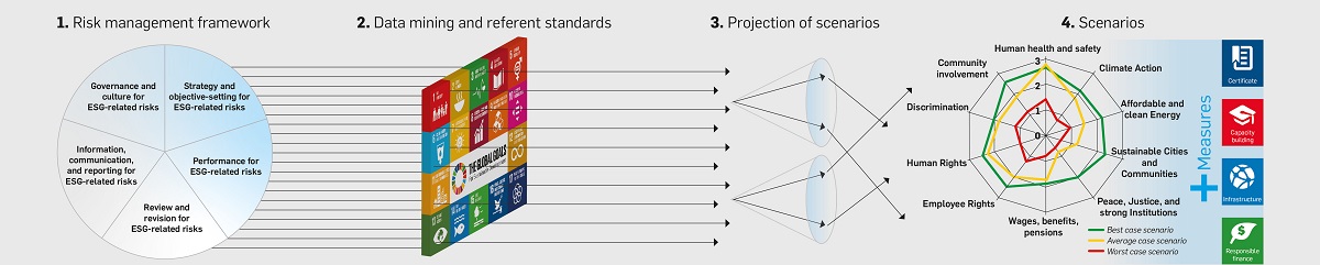 Mithilfe von Expert*innen werden für die jeweiligen Regionen die relevanten Messdaten (KPIs) zunächst bestimmt und dann in drei mittelfristigen Szenarien bewertet. So gibt es für jeden Bereich mit Blick auf das Jahr 2030 ein best case-, ein median und ein worst case- Szenario. Die teilnehmenden Unternehmen der Lieferketten wiederum werden entlang der gleichen Messdaten getestet, die Ergebnisse werden konsolidiert und mit den Szenarien abgeglichen. So entsteht nicht ein Bild von der Lieferkette, sondern je nach Entwicklungspfad drei Visionen. Nachhaltigkeitsmanagement oder auch Entwicklungshilfe kann daran ganz gezielt ansetzen und passgenau Hilfen für den gewünschten Transformationspfad geben.