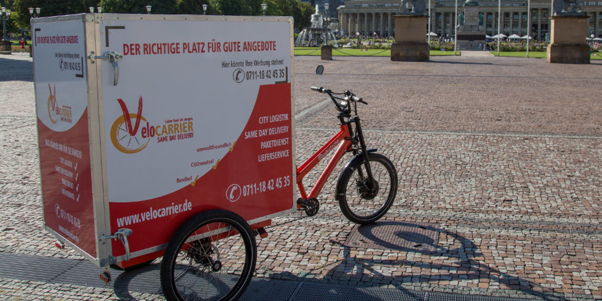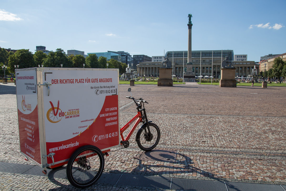 Kunden der memo AG in der Innenstadt von Stuttgart werden seit Juli 2018 mit Elektrolastenrädern der Velocarrier GmbH beliefert.