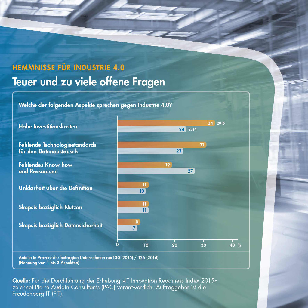 Etwas mehr als vier Jahre ist es her, dass der Begriff "Industrie 4.0" auf der Hannover Messe geprägt wurde. Und langsam aber sicher zeigt sich, woran die Umsetzung in Deutschland bisher krankt. So stolz man hierzulande auch ist, ein Vorreiter in der Diskussion des Themas zu sein, die industrielle Vernetzung steckt 2015 noch in den Kinderschuhen. Inwiefern der fertigende Mittelstand tatsächlich bereit für Industrie 4.0 ist, hat das Marktforschungsinstitut Pierre Audoin Consultants (PAC) im Auftrag der Freudenberg IT in dem jährlichen IT Innovation Readiness Index erhoben.