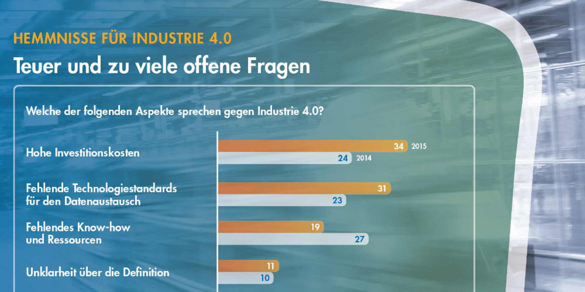 Positiv ist der steigende Bekanntheitsgrad des Themas Industrie 4.0: Fehlte in den vergangenen Jahren vielen Firmen noch die grundlegende Aufklärung, so sehen sich mittlerweile die meisten mit dem nötigen Know-how gerüstet - nur 19 Prozent aller Befragten halten diesen Faktor noch für problematisch (Stand 2014: 27 Prozent). "Die generelle Auseinandersetzung mit dem Thema führt bereits zu einem erhöhten Grundverständnis und auch das Bewusstsein für die Notwendigkeit effizienter Prozesse hat deutlich zugenommen", so die Einschätzung von Stefanie Naujoks, Analystin bei PAC.