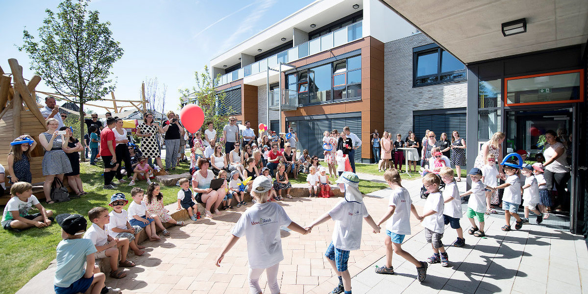 Hier, das ist im Neubau direkt gegenüber vom Gütersloher Stammwerk. Nach knapp zwei Jahren Bauzeit nahm die Einrichtung im März die ersten Kinder auf; am Dienstag feierten die Kita-Kinder mit ihren Eltern, Geschwistern und allen Beteiligten die offizielle Eröffnung, insgesamt etwa 220 Gäste. Mit dabei Vertreter der Geschäftsleitung – Olaf Bartsch, Geschäftsführer Finanzen/Hauptverwaltung, die Geschäftsführenden Gesellschafter Dr. Markus Miele und Dr. Reinhard Zinkann; als besondere Gäste Dr. Peter Zinkann und Dr. Karin Zinkann und Bürgermeister Henning Schulz, der sich an die Zeit als junger Vater und die Probleme mit den Schließungszeiten der Kita erinnerte. Die Eltern der Miele-Kita haben es da leichter: Das „IdeenReich“ ist bis 18 Uhr abends und ganzjährig geöffnet. Schließlich soll die neue Kita vor allem eines: Den Eltern, in der Mehrzahl Miele-Mitarbeiterinnen und Mitarbeiter, die bessere Vereinbarkeit von Familie und Beruf ermöglichen. Dafür hat das Unternehmen 3,5 Millionen Euro in die Kita investiert, die Kosten für den Gesamtkomplex mit Wohnungen, Büros und Tiefgarage belaufen sich auf 7,2 Millionen Euro.