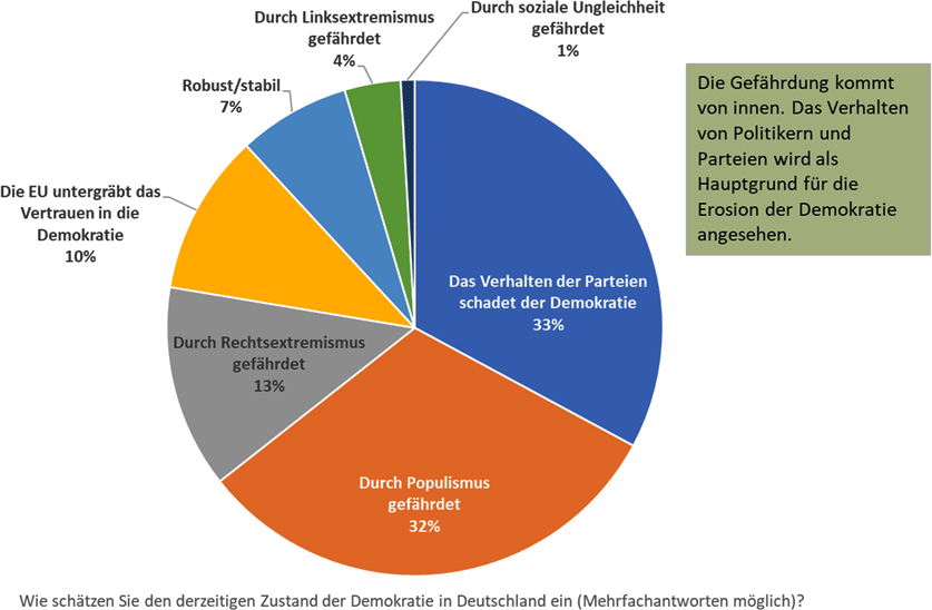 Erstaunlicherweise steht die Gefährdung von innen als Ursache weit vorne. Das Verhalten von Politikern und Parteien wird als Hauptgrund für die Erosion der Demokratie angesehen. Zwei Drittel der Aussagen zielen darauf ab. Die Parteien selbst und der grassierende Populismus stehen im Fokus des Problems. Rechts- und Linksextremismus werden im Vergleich dazu als weniger bedeutsam angesehen und die EU – heutzutage Zielscheibe nationalistisch-populistischer Anfeindungen – wird kaum als Grund für die demokratische Entfremdung verstanden.