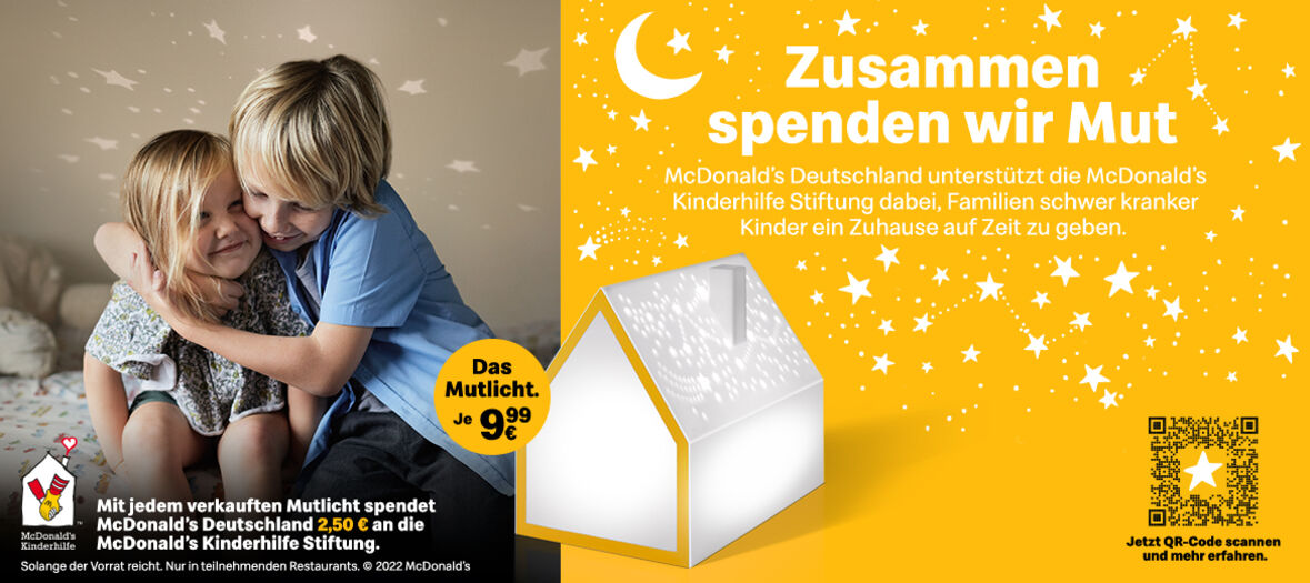 Die Trostpflaster-Aktion ist aber nur ein Teil des Engagements des Systemgastronomen für die McDonald’s Kinderhilfe Stiftung. Im Herbst 2022 bot das Unternehmen die sogenannten Mutlichter in ausgewählten Restaurants an, die Kindern als Nachtlichter dienen. Von jedem verkauften Mutlicht spendete McDonald’s jeweils zwei Euro fünfzig für die Stiftung.