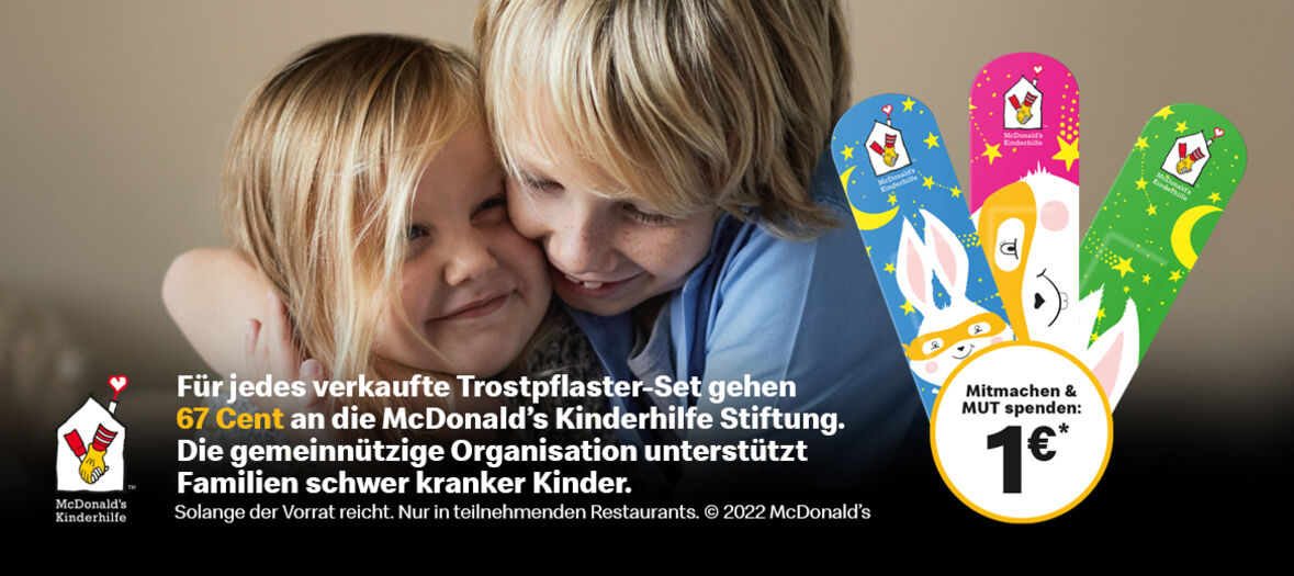 McDonald’s Deutschland unterstützt bereits seit vielen Jahren die Arbeit der gemeinnützigen McDonald’s Kinderhilfe Stiftung mit der Trostpflaster-Aktion. Kundinnen und Kunden können die Pflasterbriefchen, in denen sich jeweils drei Pflaster mit Trosthasen in unterschiedlichen Farben befinden, für einen Euro erwerben. Davon gehen dann 67 Cent an die Stiftung.