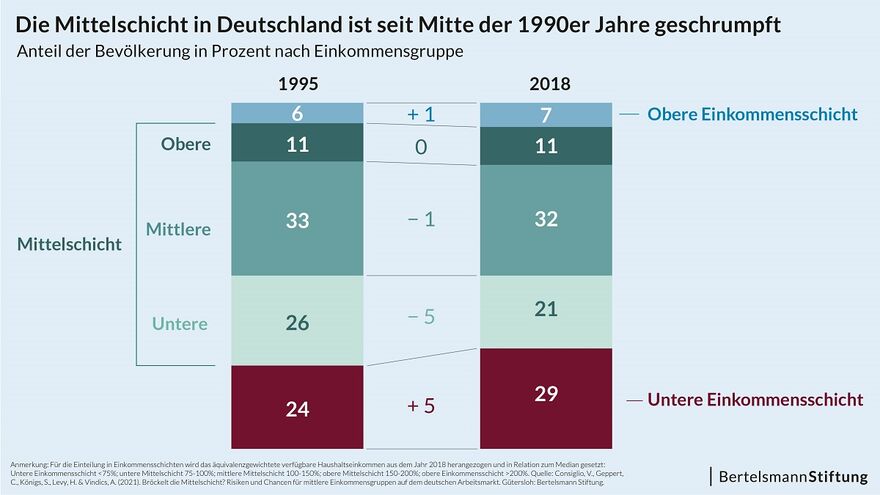 Der Zugang zur Mittelschicht hat sich deutlich verschlechtert: 1995 zählten noch 70 Prozent der Bevölkerung zur mittleren Einkommensgruppe, 2018 waren es nur noch 64 Prozent. Zwar fand der wesentliche Rückgang bis 2005 statt, doch die Mitte erholte sich seither nicht wieder, obwohl die deutsche Wirtschaft stetig gewachsen und die Arbeitslosigkeit gesunken ist. Um die Mittelschicht zu stärken, fordern OECD und Bertelsmann Stiftung unter anderem dazu auf, Barrieren auf dem Arbeitsmarkt abzubauen.