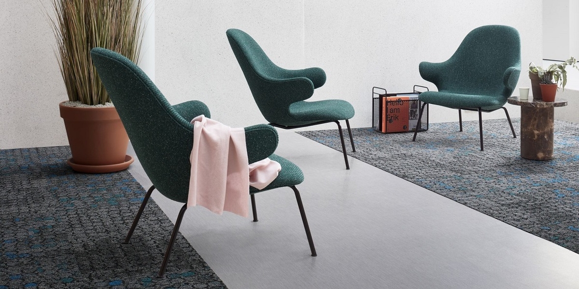 In dem Gebäude in Mannheim sind unter anderem die Teppichfliesen der Kollektion Net Effect zum Einsatz gekommen, um eine Art Meeresoptik in einer der Office-Boxen zu erzeugen. Weitere farbliche Akzente wurden durch die Teppichfliesen der Kollektionen Urban Retreat und Human Connections gesetzt; die Kollektion Composure wiederum sorgt für neutrale, aber in der Struktur spannende Flächen. Einblicke in das Projekt gewährt das aktuelle Referenzbuch 2020/21 von Interface.
