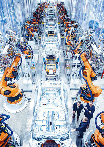 Vom mobilen Arbeiten über den Einsatz von Robotern in der Produktion bis hin zu digitalen Lernmitteln: Der Trend zur Digitalisierung verändert auch die moderne Arbeitswelt. Im Stammwerk Ingolstadt beispielsweise kommen bei der Audi A4-Montage schon jetzt Roboter zum Einsatz, die Hand in Hand mit den Menschen arbeiten. Roboter Adam etwa übernimmt ergonomisch unvorteilhafte Tätigkeiten für die Mitarbeiter. "Dabei muss der Roboter im Takt des Menschen arbeiten – und nicht der Mensch im Takt des Roboters", stellt Karl Unger, Leiter Produktionsstrategie/-system und Technologieentwicklung bei Audi, klar. "Wenn wir diese Regel beherzigen, wird der Ausbau von Mensch-Roboter-Kooperationen auf eine hohe Akzeptanz bei den Mitarbeitern stoßen."