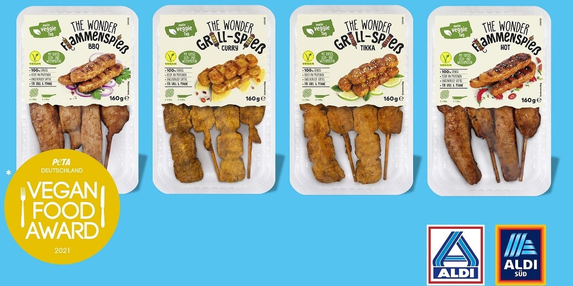 ALDI Nord und ALDI SÜD erhalten das dritte Jahr in Folge Anerkennung für ihr veganes Produktsortiment. Die Tierrechtsschutzorganisation PETA zeichnet die Discounter in der Kategorie „Bestes veganes Grillprodukt“ für ihre „The Wonder Grill- und Flammenspieße“ auf Sojabasis aus.