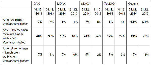Eine gegenläufige Entwicklung verzeichnen die DAX-Unternehmen: Bei ihnen ist nicht nur die Gesamtzahl von Frauen in den Vorständen gestiegen, auch der Anteil der Unternehmen mit mindestens einer Frau im Vorstand hat deutlich zugenommen. Von 188 Vorstandsmitgliedern waren zum 31. Dezember 2014 14 Frauen, das entspricht einem Anteil von sieben Prozent. Vor einem Jahr waren nur elf von 188 Vorstandsmitgliedern weiblich. Gleichzeitig stieg der Anteil von DAX-Unternehmen mit mindestens einer Frau im Vorstand von 30 auf 40 Prozent.
