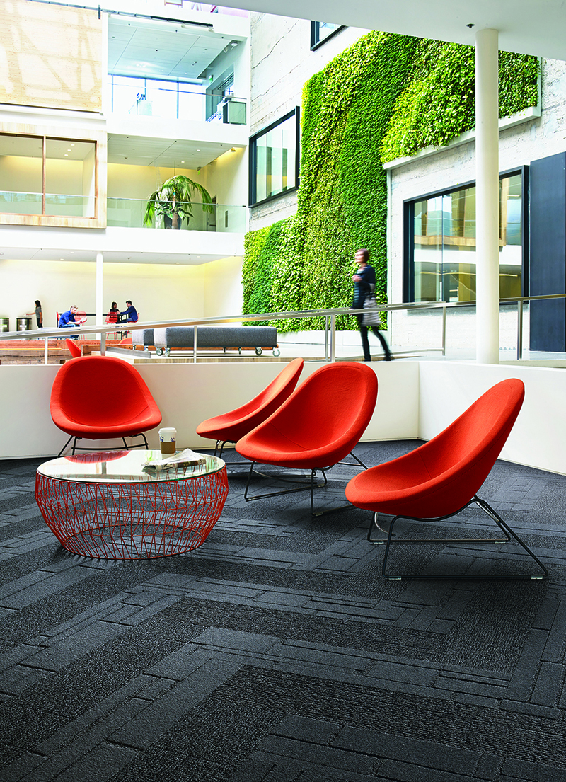 Um die Gesundheit und das Wohlbefinden am Arbeitsplatz und in der Lebenswelt zu steigern, setzt Interface gezielt Biophilic Design bei seinen Kunden in der Praxis ein. „We make carpet tile, but we sell design“ lautet ein Slogan des Unternehmens, der sofort spürbar ist, wenn man entsprechend gestaltete Räume betritt. Die modularen Bodenbelagslösungen mit ihren verschiedenen Mustern, Texturen und Farben sind dabei Teil eines umfassenderen Innenraumdesigns, das zum Verweilen, zur Rekreation und Kreation einlädt.