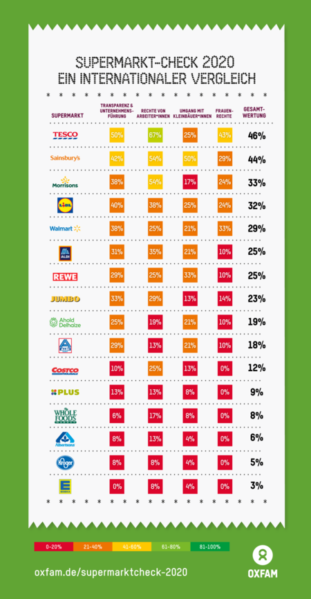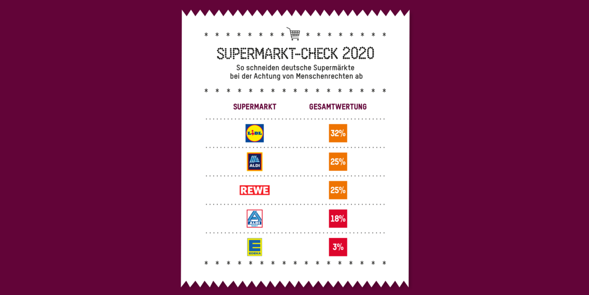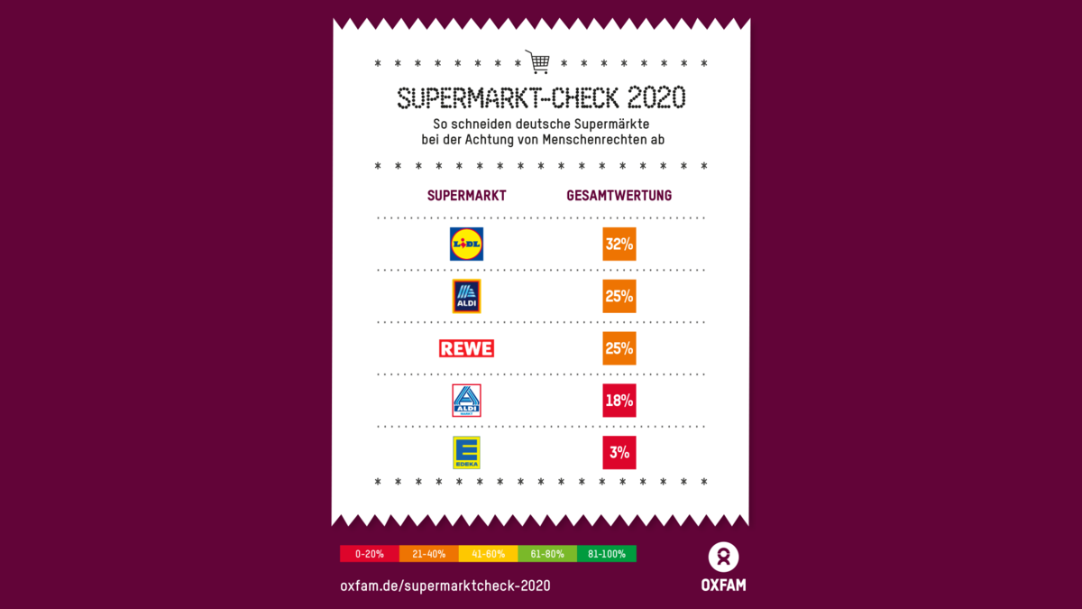 Oxfams Supermarkt-Check analysiert und bewertet die Geschäftspolitik von 16 Supermärkten in Deutschland, Großbritannien, den USA und den Niederlanden in Bezug auf ihren Umgang mit Menschenrechten. Dabei werden die Themen Transparenz, Arbeitnehmerrechte, der Umgang mit Kleinbäuerinnen und -bauern sowie Frauenrechte unter die Lupe genommen. Das Ergebnis 2020: Lidl, Rewe und Aldi haben sich zwar verbessert, doch noch immer erreicht kein deutscher Supermarkt mehr als ein Drittel der möglichen Punkte. „Was uns Corona-Ausbrüche in deutschen Schlachtbetrieben vor Augen führen, ist auch in den internationalen Lieferketten menschenunwürdige Realität mit bitteren Folgen: Konzerne tun zu wenig dagegen, dass die Menschen, die das Essen in den Supermarktregalen herstellen, ausgebeutet werden“, sagt Franziska Humbert, Oxfam-Expertin für Wirtschaft und Menschenrechte.