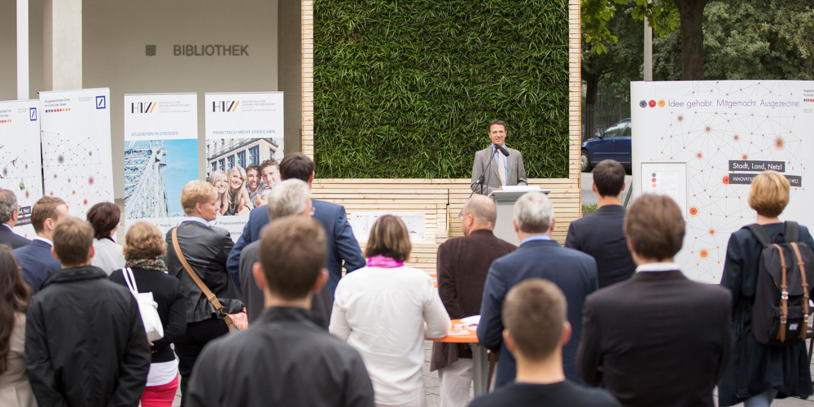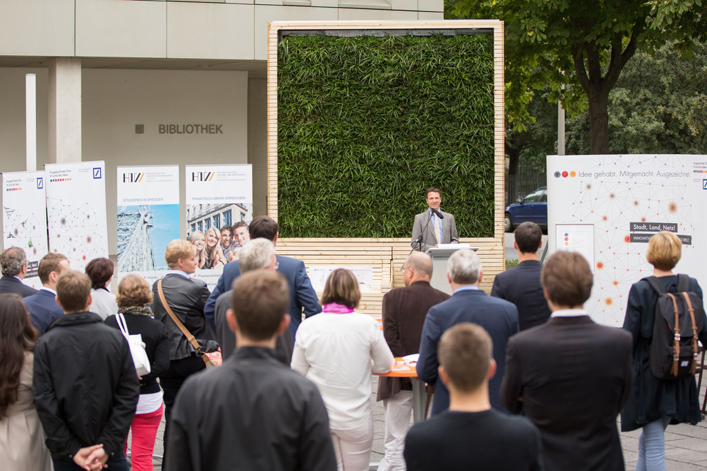 Green City Solutions, das Team aus der Gründungsschmiede der HTW Dresden, ist mit seinem Projekt „CityTree – Multifunktionale Grünfläche für die intelligente Stadt“ einer der 100 Preisträger im bundesweiten Innovationswettbewerb „Ausgezeichnete Orte im Land der Ideen“ 2015. Zum Thema „Stadt, Land, Netz! Innovationen für eine digitale Welt“ liefert das Projekt in der Kategorie Umwelt eine Antwort auf die Frage, wie ein Pflanzsystem die Luft einer Stadt verbessern und gleichzeitig Bürger und Unternehmen digital vernetzten kann.