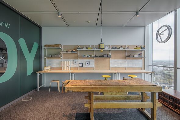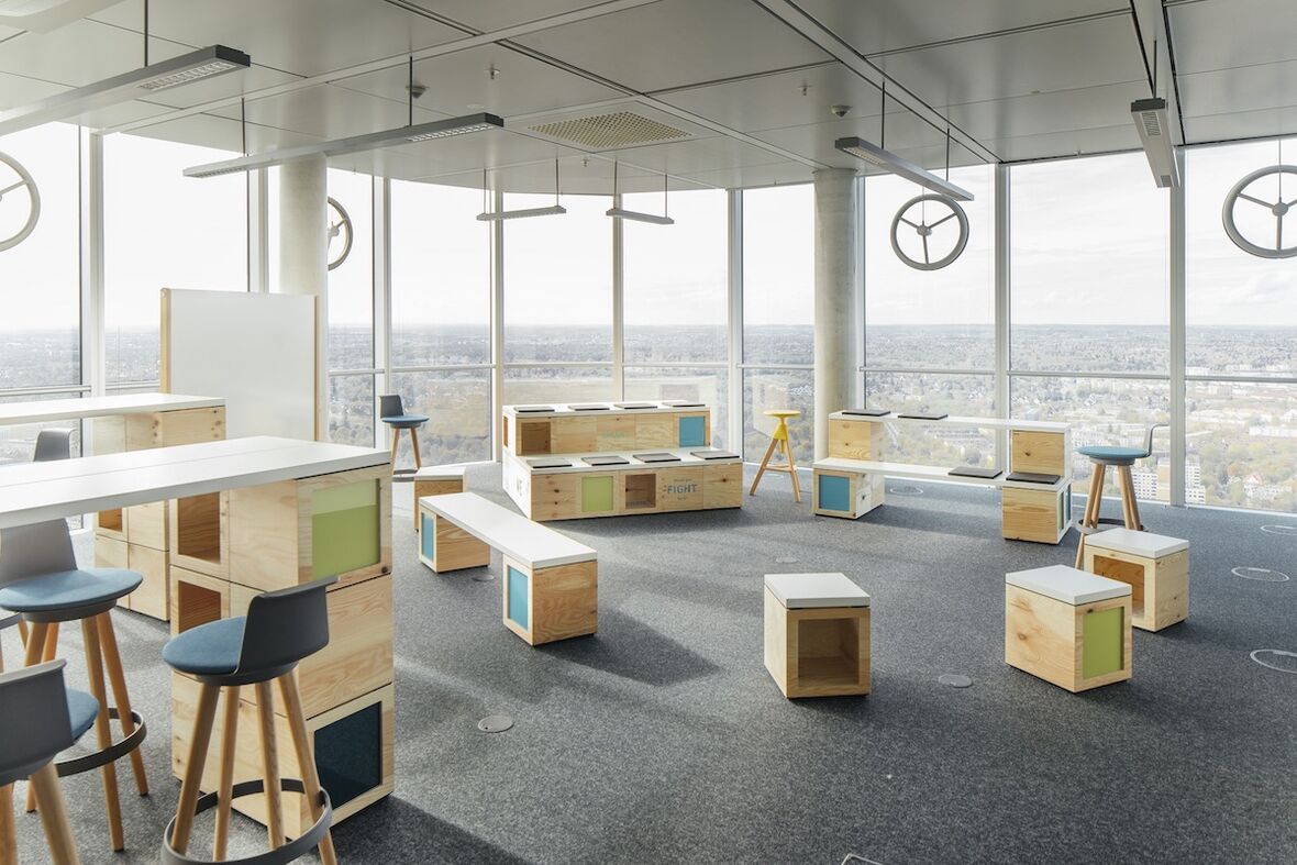 Unternehmensbesprechungen finden meist in nüchternen Räumen statt. Die Teilnehmer diskutieren sitzend oder lauschen Frontalvorträgen. Anders im O2-Tower in München: Die Menschen, die sich dort ganz oben im 350 Quadratmeter großen „FreiRaum“ treffen, laufen vor atemberaubender Aussicht auf das Panorama der Bayern-Metropole umher, bauen an der Werkbank Modelle oder nutzen die moderne Medientechnik. Sitzen können sie auf einem der vielen Holzwürfel, mit denen sich aber auch Stehtische, Tribünen und viele weitere Raumelemente zusammenstellen lassen.