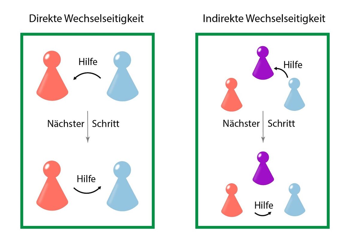 Das zentrale Konzept in der Arbeit der Forscher*innen sind Interaktionen, die auf direkter und indirekter Wechselseitigkeit beruhen. „Eine Interaktion, die auf direkter Wechselseitigkeit beruht, bedeutet einfach ‚Eine Hand wäscht die andere'„, erklärt Laura Schmid. „Sie kommt sowohl Menschen als auch bei verschiedenen Tierarten vor.“