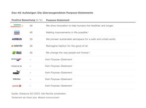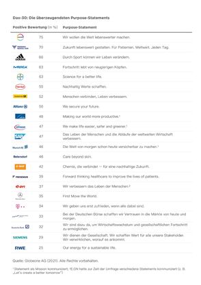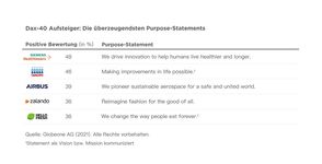 Wie die Formulierungen des übergeordneten Unternehmenszwecks der Dax-Unternehmen in der Öffentlichkeit ankommen, hatte Globeone bereits im Frühjahr im Rahmen der Purpose Readiness Studie 2021 veröffentlicht und dafür mehr als 3.000 Konsumentinnen und Konsumenten über ein unabhängiges Meinungsforschungsinstitut befragen lassen. Immerhin 22 bisherige Dax-30-Mitglieder kommunizierten zu diesem Zeitpunkt ein Purpose-Statement, 13 von ihnen konnten mit ihren Formulierungen Zustimmungswerte von wenigstens knapp 50 Prozent oder mehr erreichen. Die Spitzenreiter lauteten Covestro (75 Prozent), Fresenius Medical Care (70 Prozent) und Adidas (66 Prozent).