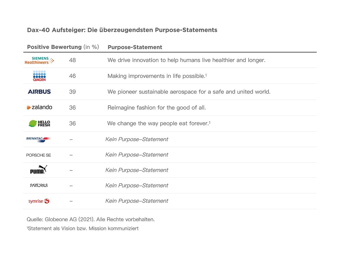 Im neuen Dax-40 klaffen insbesondere bei den Index-Aufsteigern dagegen noch erhebliche Purpose-Lücken. Brenntag, Porsche SE, Puma, Sartorius und Syymrise haben bislang offenbar noch gar kein griffiges Statement veröffentlicht. Und zwei der Neulinge, Qiagen und Hellofresh, kommunizieren ihre Statements offiziell jeweils als Vision und Mission. „Nur wenn Unternehmen glaubhaft einen positiven Beitrag zur Gesellschaft leisten, raten wir dazu, sich über einen Purpose zu positionieren”, so Simon Aschermann, Manager bei Globeone. „Auch unter den Dax-Neulingen haben viele das Potenzial dazu, lassen die Chance bislang aber ungenutzt verstreichen.”