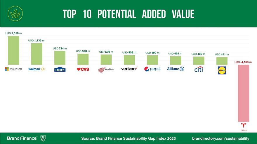 Umgekehrt hat Microsoft laut der Untersuchung von Brand Finance den höchsten positiven Gap-Wert aller Marken – 1,5 Milliarden US-Dollar. Dies zeigt, dass die Nachhaltigkeitsleistung von Microsoft seine Nachhaltigkeitswahrnehmung übersteigt. Das bedeutet, dass Microsoft die Möglichkeit hat, durch eine verbesserte Kommunikation seiner Nachhaltigkeitsinitiativen und -dienstleistungen bis zu 1,5 Milliarden US-Dollar zu generieren.