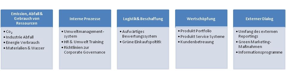 Um die Komplexität einer Evaluation zu vereinfachen, sollten die Umweltindikatoren zusammen in jeweilige Kategorien der internen und externen Einbindung unterteilt werden. So sind die internen Indikatoren wie beispielsweise Energieverbrauch, Unterstützung des Managements oder Einsatz der Mitarbeiter von den externen zu trennen. Die Frage, wie nachhaltig das Produkt-Portfolio nach Verkaufs- und Green Marketing-Initiativen und Reporting ist, spielt hier eine Rolle. Darüber hinaus bezieht sich die externe Einbindung auf die gegenseitige Beeinflussung von Unternehmen und Stakeholdern.